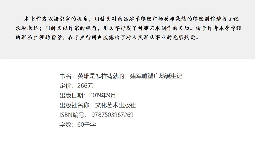 这组雕塑是八一南昌起义暨建军九十周年纪念日到来之际,在南昌市红谷滩凤凰洲市民公园建成开放的。它采取“3+6”框架,东西轴上为“牛行集结”“挥师渡江”“军旗升起”3座雕塑,南北方位为“星火燎原”“抗战先锋”“解放全国”“钢铁长城”“精兵之路”“强军兴军”6座雕塑。整个雕塑群是由中央美院雕塑系教授孙伟带领130多人的团队,经过3年时间完成的。而本书作者罗水长则是用镜头全景式记录英雄“诞生”的唯一摄影家。