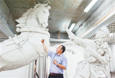 中央美院雕塑系教授孙伟在现场比划姿势